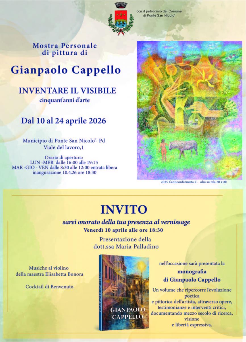 “Inventare il visibile”, mostra personale di pittura di Gianpaolo Cappello, testo per brochureGianpaolo Cappello, nel suo percorso cinquantennale attraverso la pittura ha condotto innanzi la suaricerca procedendo dalla materia all'immateriale, al pensiero, per poi ritornare alla materia,seguendo una progressione ciclica che coinvolge i mezzi sia tecnici che concettuali del fare arte.Tutto parte dalla natura, dal suo ambiente d'origine, ma la svolta stilistica fondamentale avvieneall'inizio degli anni '80, allorché il lingauggio muta completamente di segno, per approdare ad unasemi-astrazione di stampo cubista, con elementi simbolisti, che prefigura il Totalismo successivo:un sincretismo di istanze differenti e ben riconoscibili, fra impressioniste, espressioniste, simboliste,romantiche, metafisiche, astrattiste, informali e pop. Il tutto si fonde in una unità che è in effettiframmentazione: osserviamo sulla tela affiancarsi e sovrapporsi di stralci di corpi e velature,elementi grafici, inserimenti di collage, che mantengono comunque una coerente unitarietà earmonia della composizione, in cui lo sguardo spazia, per cercare un senso, ricostruire una storia,che si avvicini a quella dell'autore, pur rimanendo personale.Dalla riflessione sulla forma, il pittore procede ad approfondire quella sulla luce e sul colore, agliinizi degli anni 2000, mentre negli esiti più recenti una coesione d'insieme è ricostituita, ma mutatadi segno: tutti i presupposti su cui l'artista si è interrogato precedentemente, nei lunghi anni diricerca, si sono accorpati per ottenere una stratificazione fra immanenza e trascendenza, in cui lameditazione sullo spazio diviene predominante, e quello spaesamento indotto dalla compresenza dicosì tanti spunti di analisi diventa il presupposto per intuire la coesistenza di più piani di realtà.06.03.2026 Maria Palladino